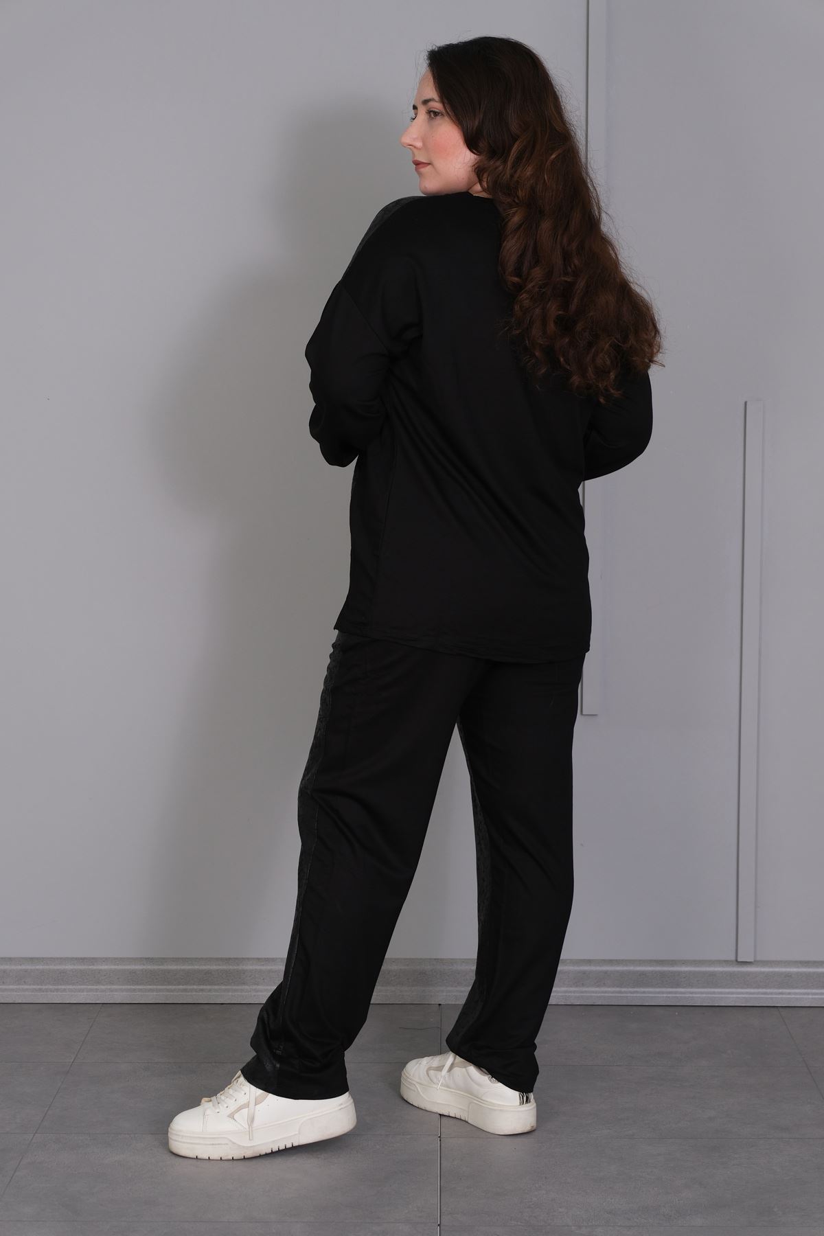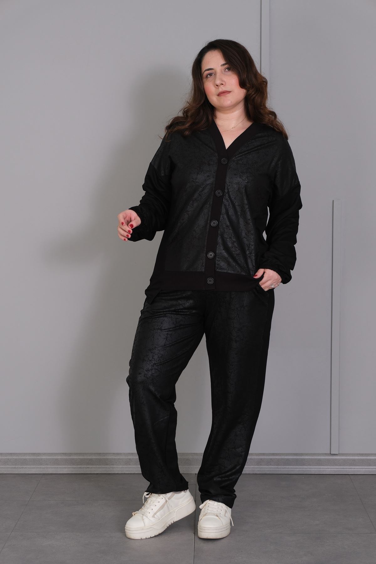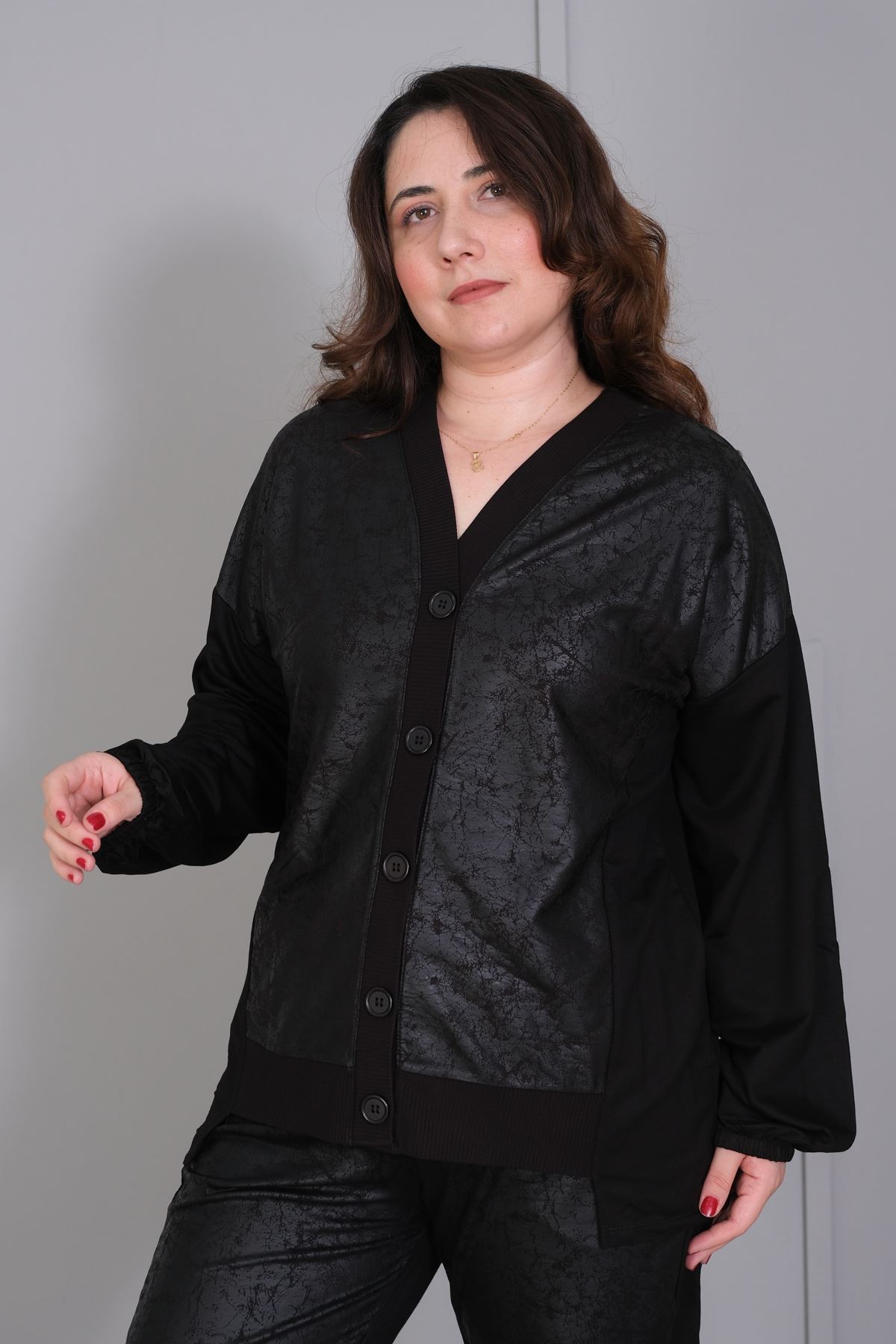 RENKTE BÜYÜK BEDEN DERİ GARNİLİ DÜĞMELİ SİYAH TAKIM