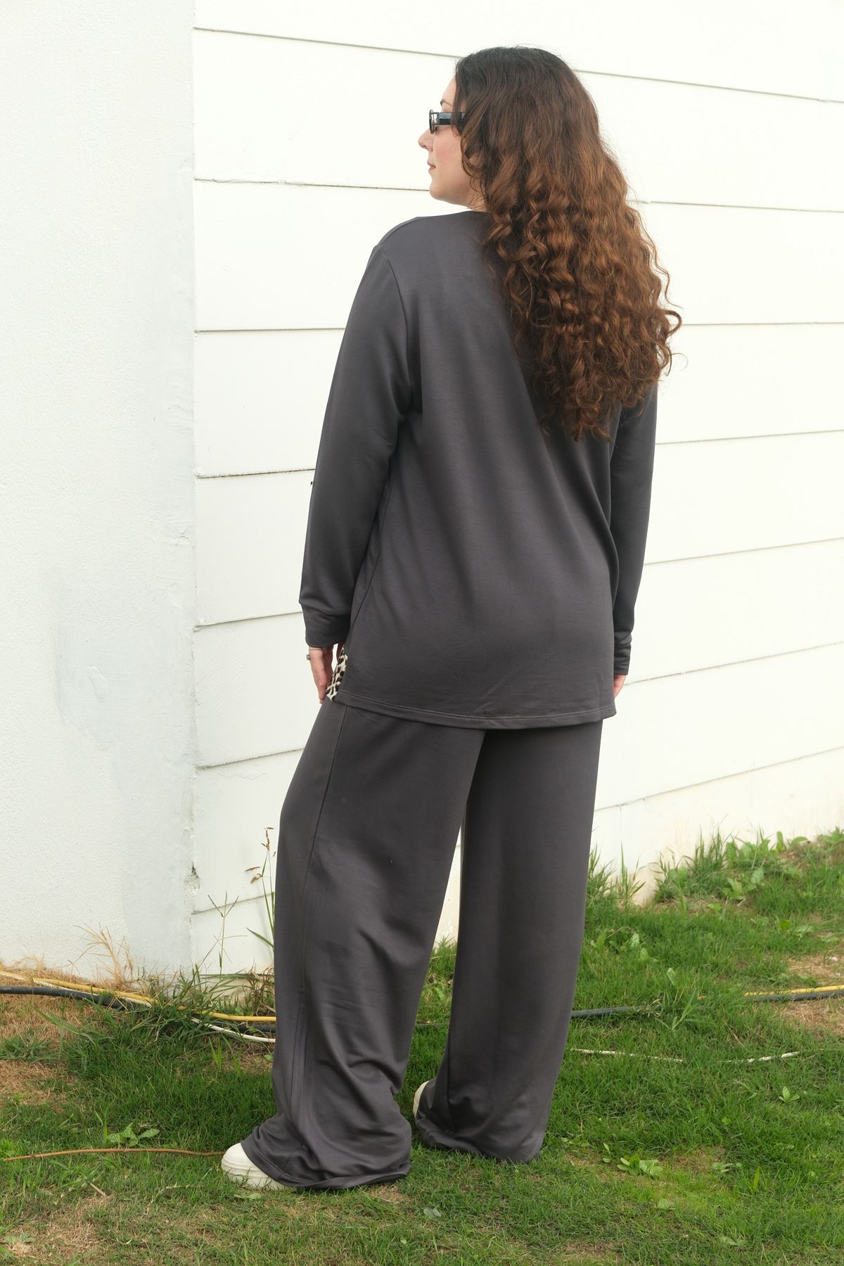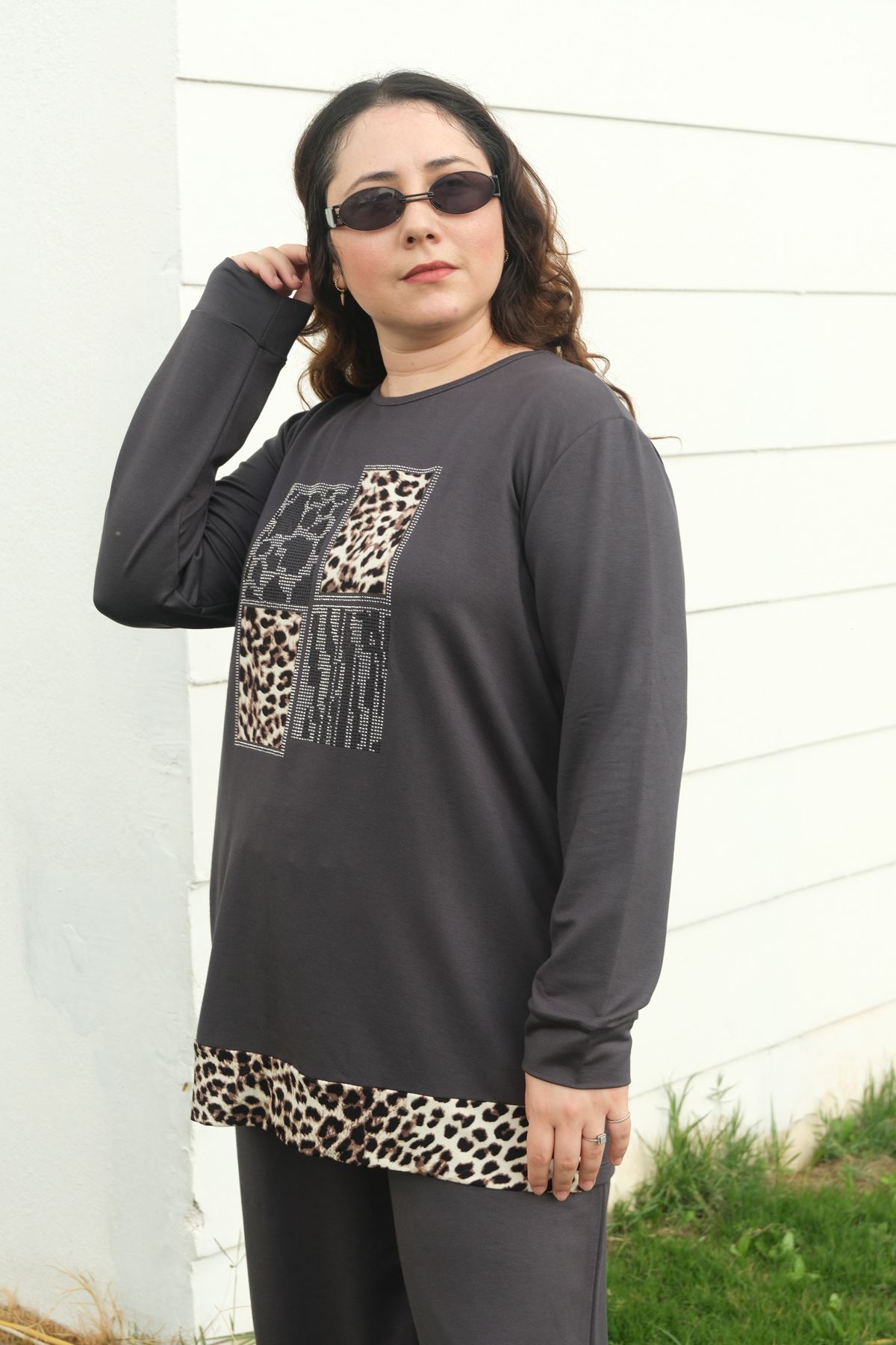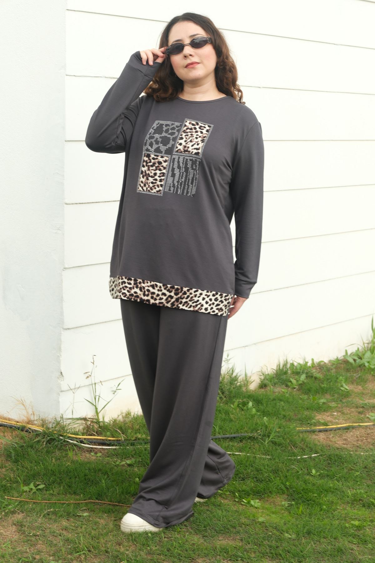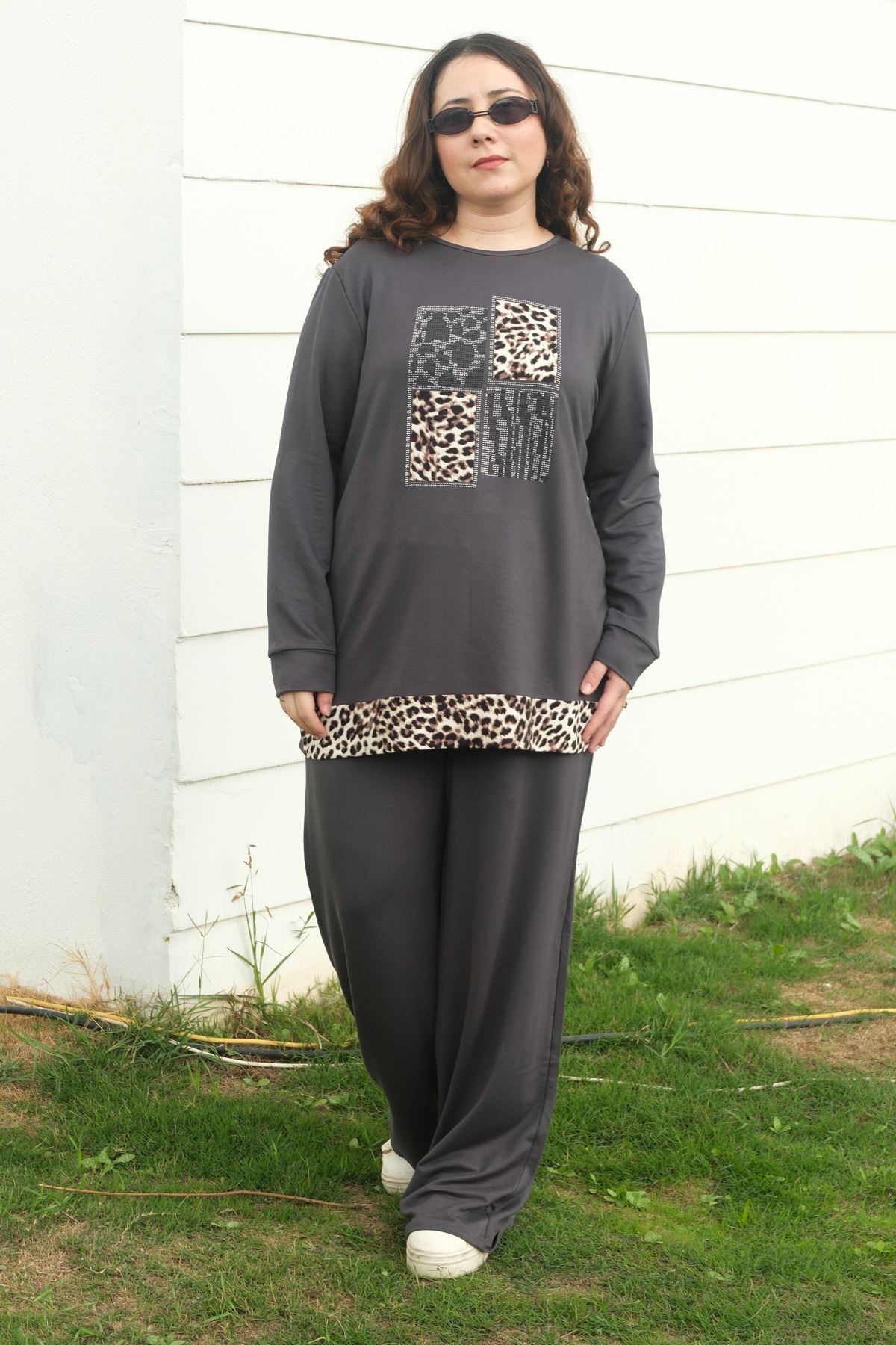RENKTE BÜYÜK BEDEN LEOPAR DETAYLI ANTRASİT TAKIM