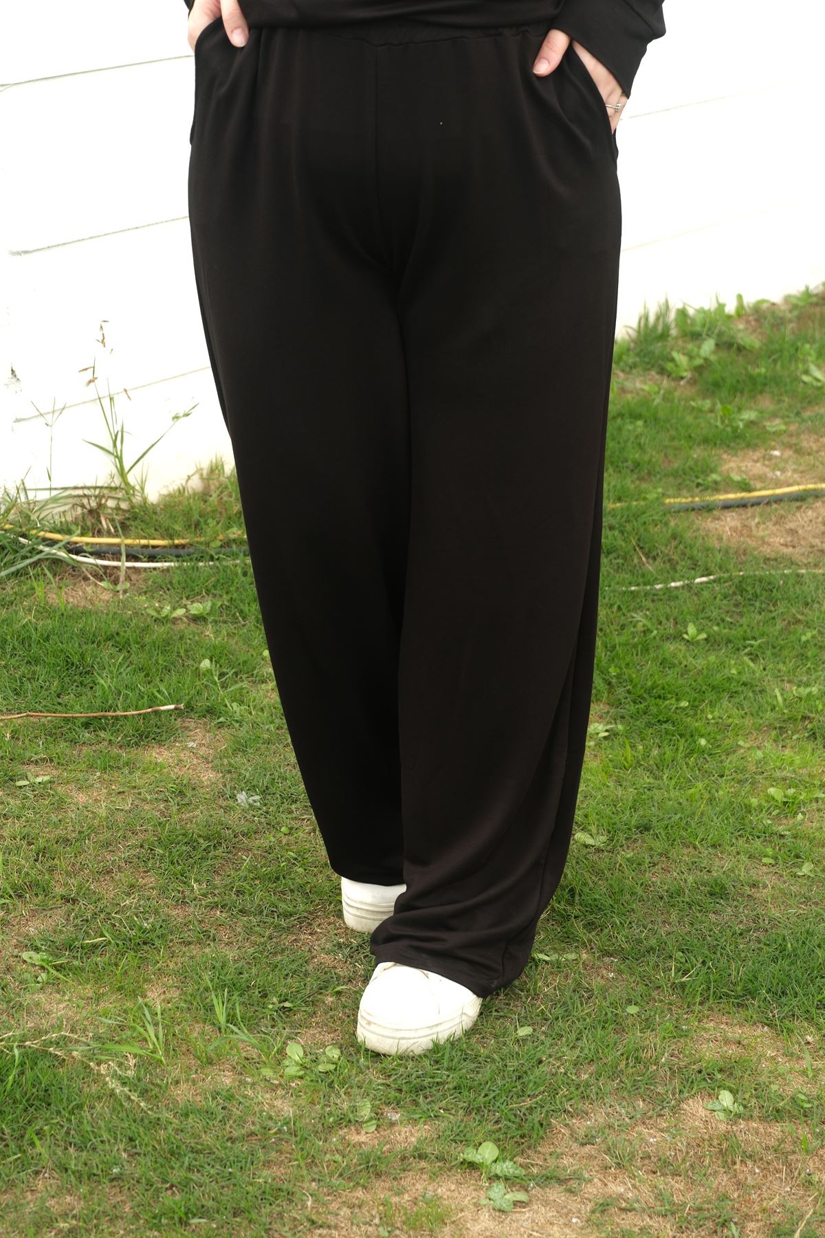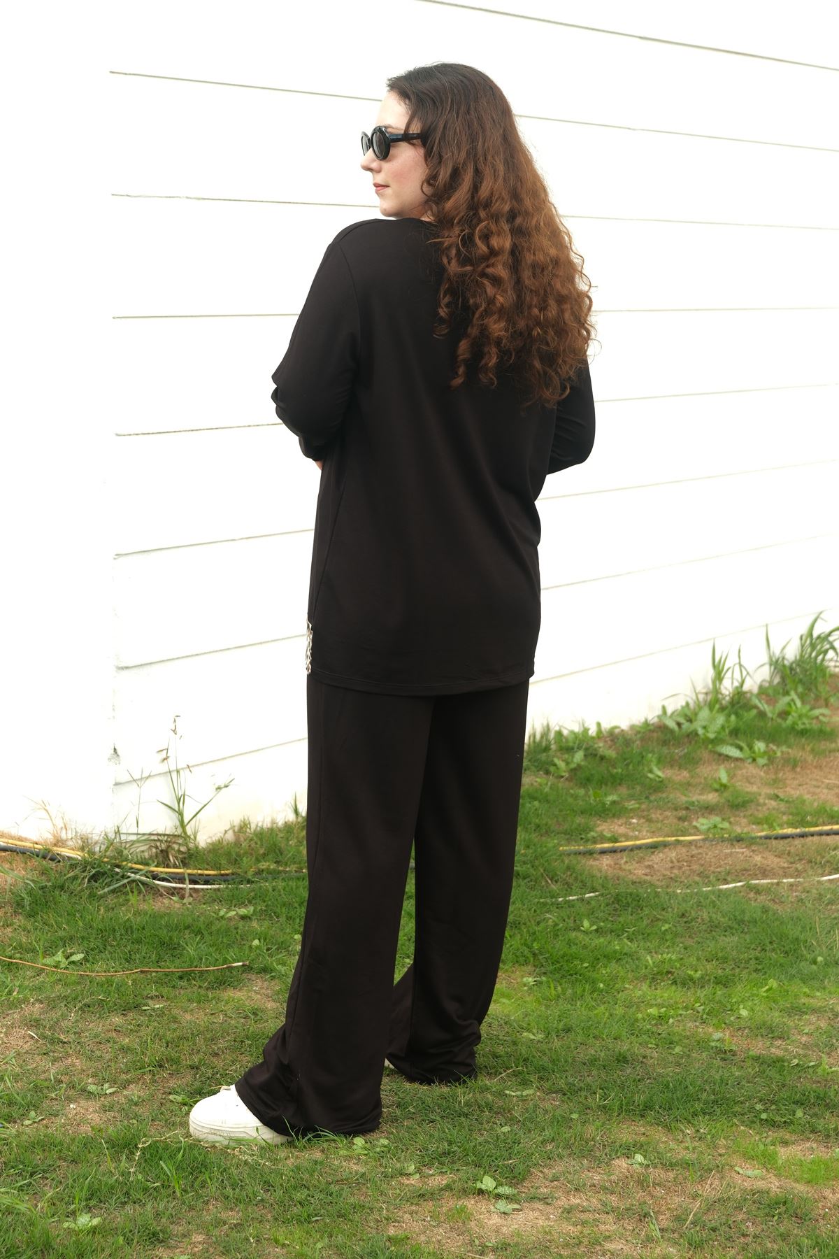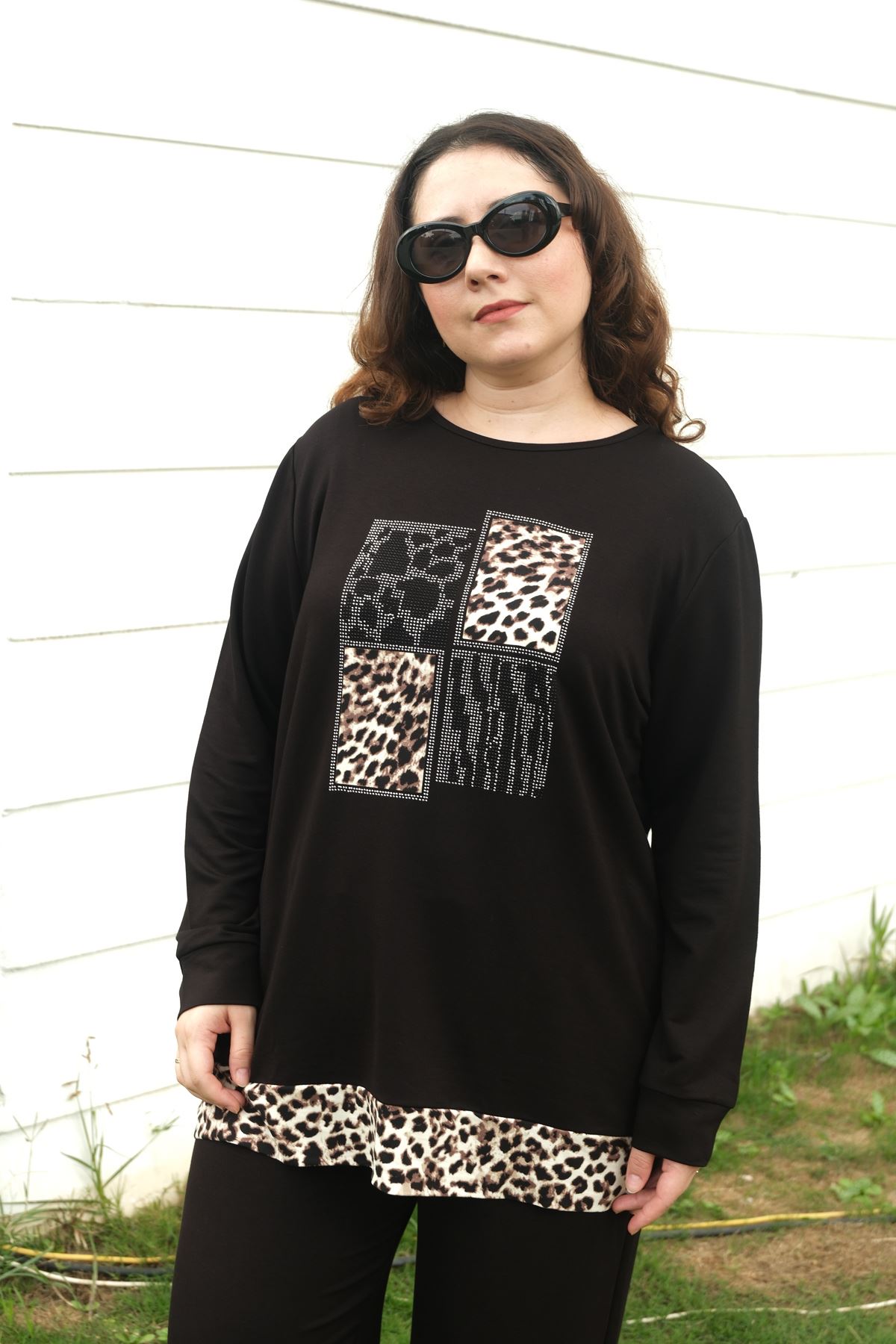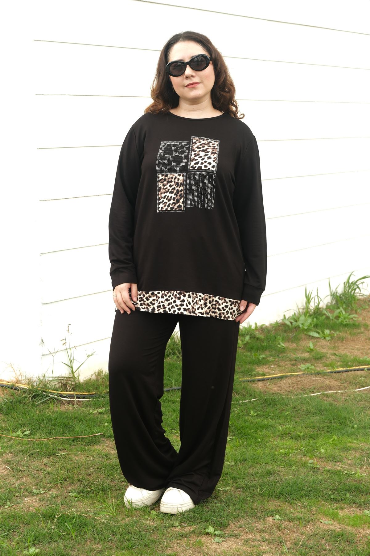 RENKTE BÜYÜK BEDEN LEOPAR DETAYLI SİYAH TAKIM
