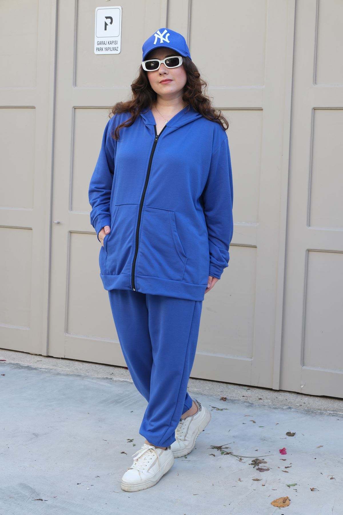 RENKTE BÜYÜK BEDEN ÖZEL ÜRETİM FERMUARLI SAKS MAVİ EŞOFMAN TAKIMI