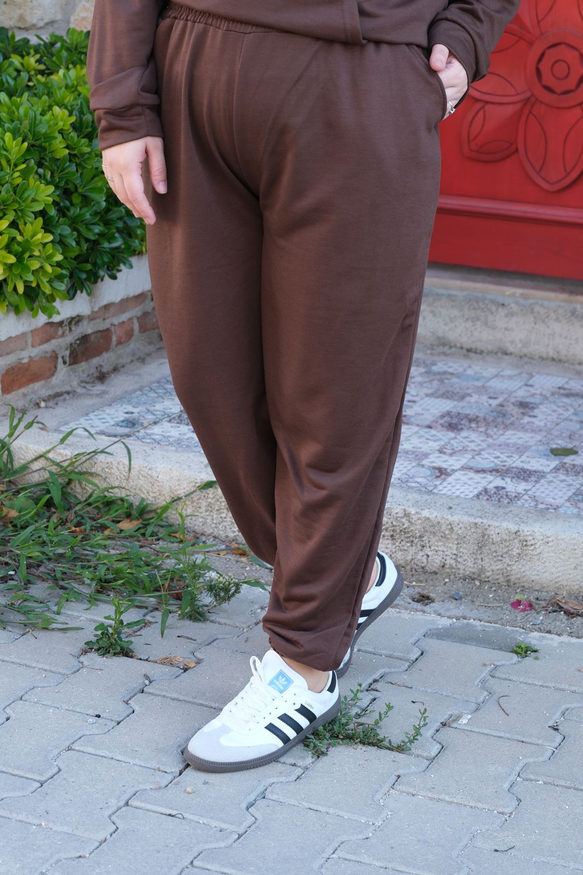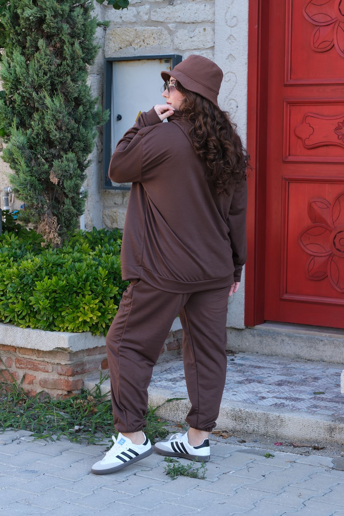 RENKTE BÜYÜK BEDEN ÖZEL ÜRETİM KANGURU CEPLİ KAHVERENGİ EŞOFMAN TAKIMI