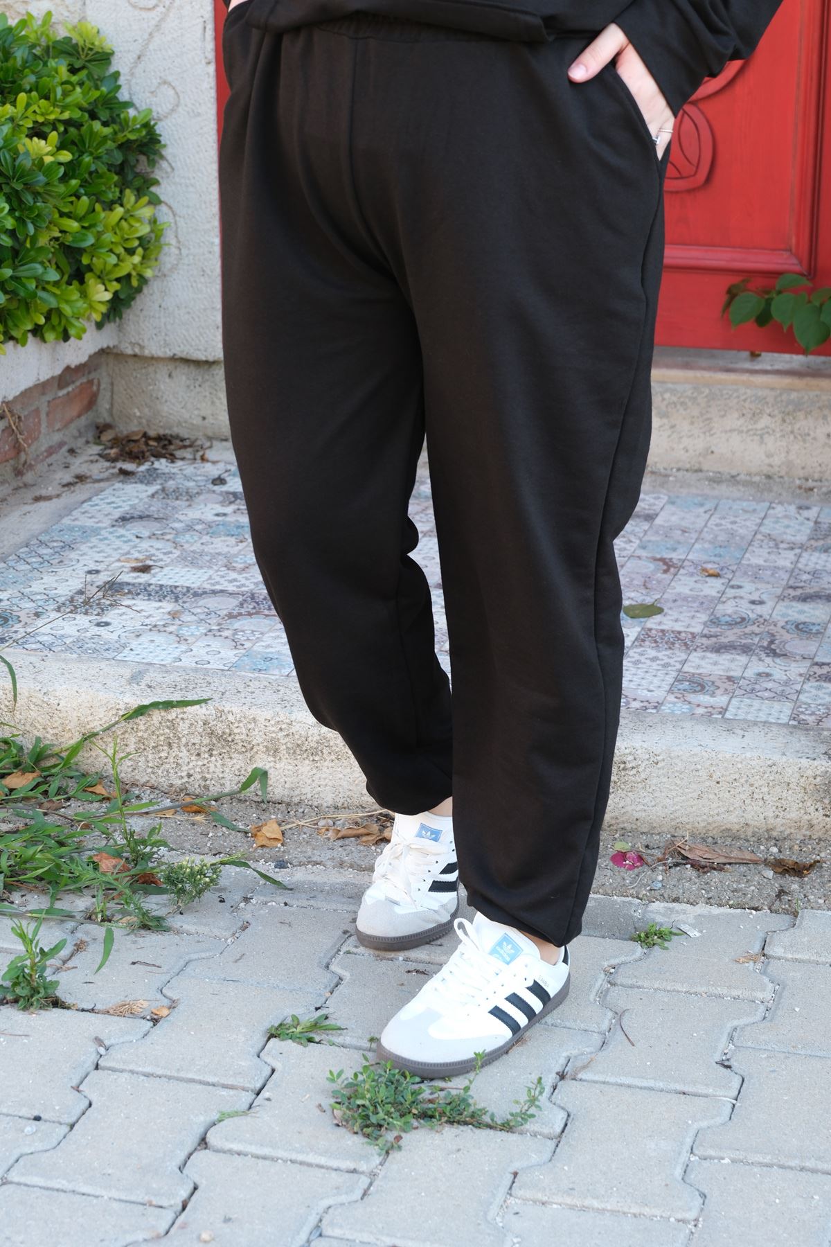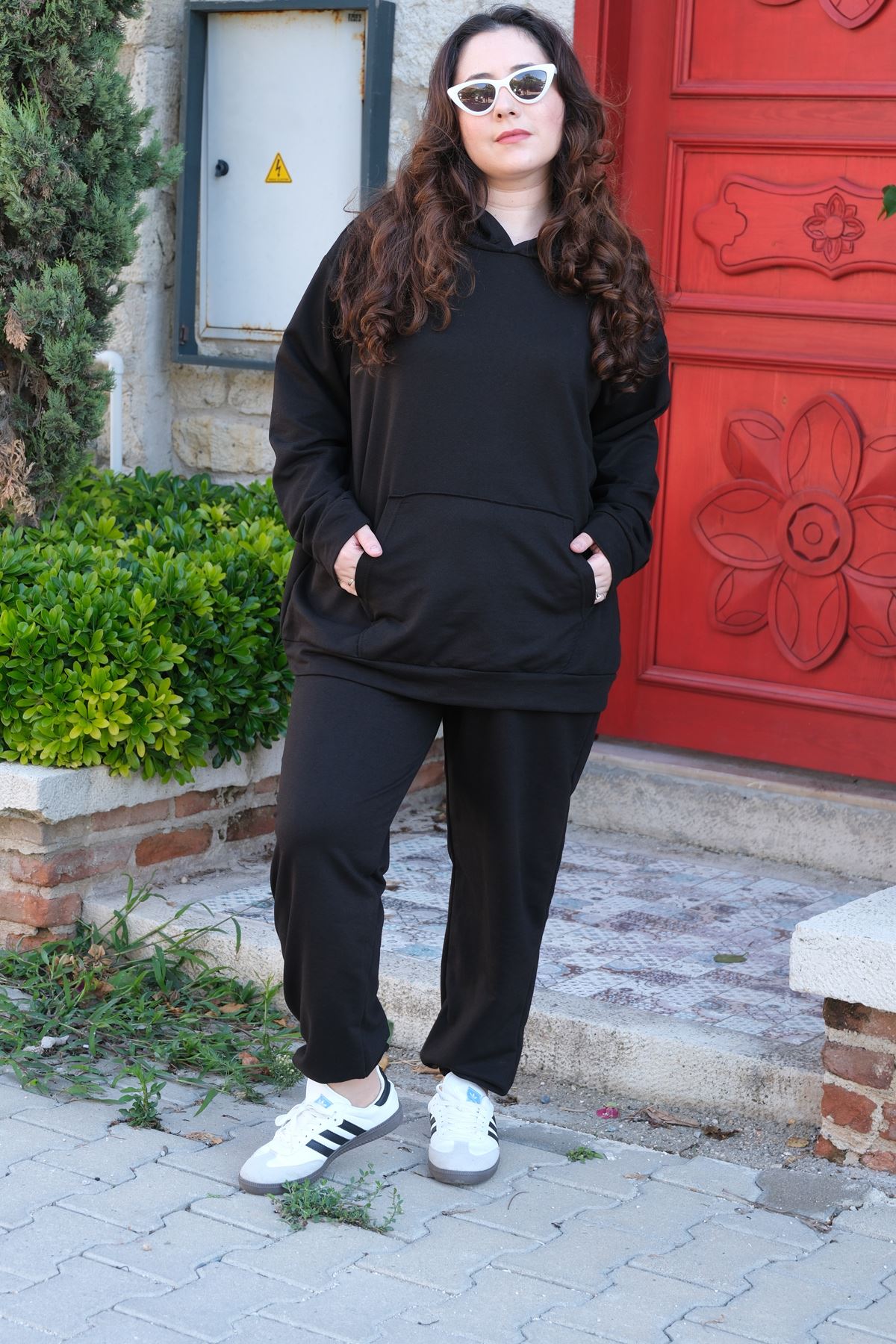 RENKTE BÜYÜK BEDEN ÖZEL ÜRETİM KANGURU CEPLİ SİYAH EŞOFMAN TAKIMI