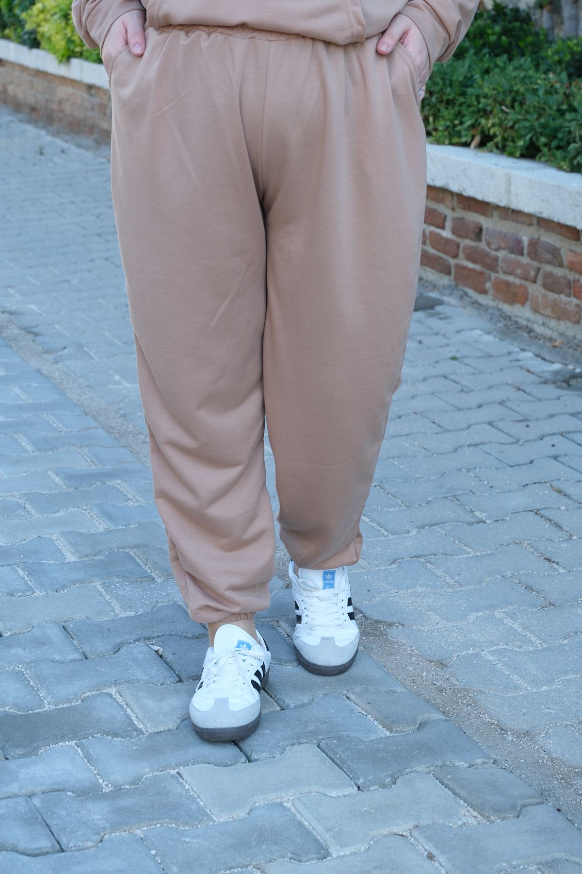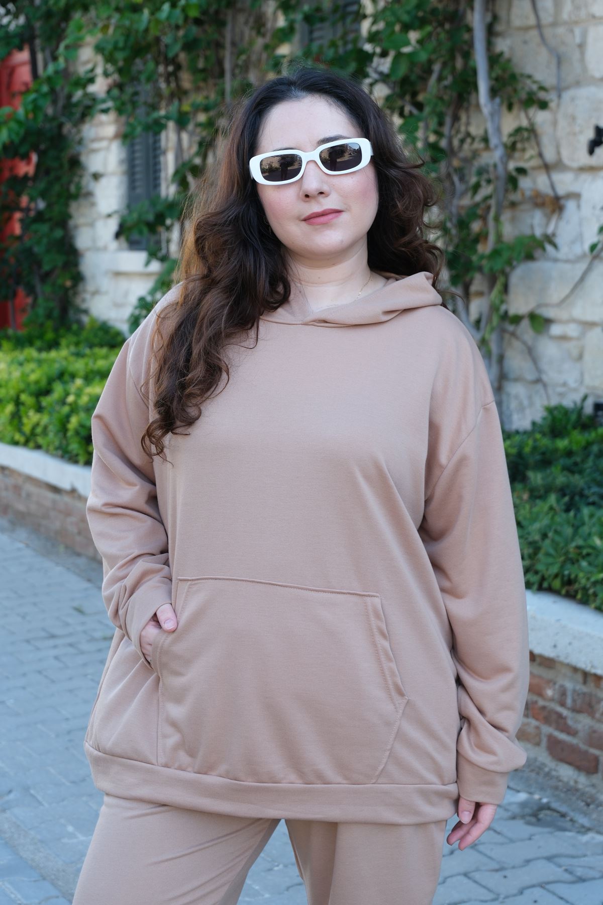 RENKTE BÜYÜK BEDEN ÖZEL ÜRETİM KANGURU CEPLİ SÜTLÜ KAHVE EŞOFMAN TAKIMI