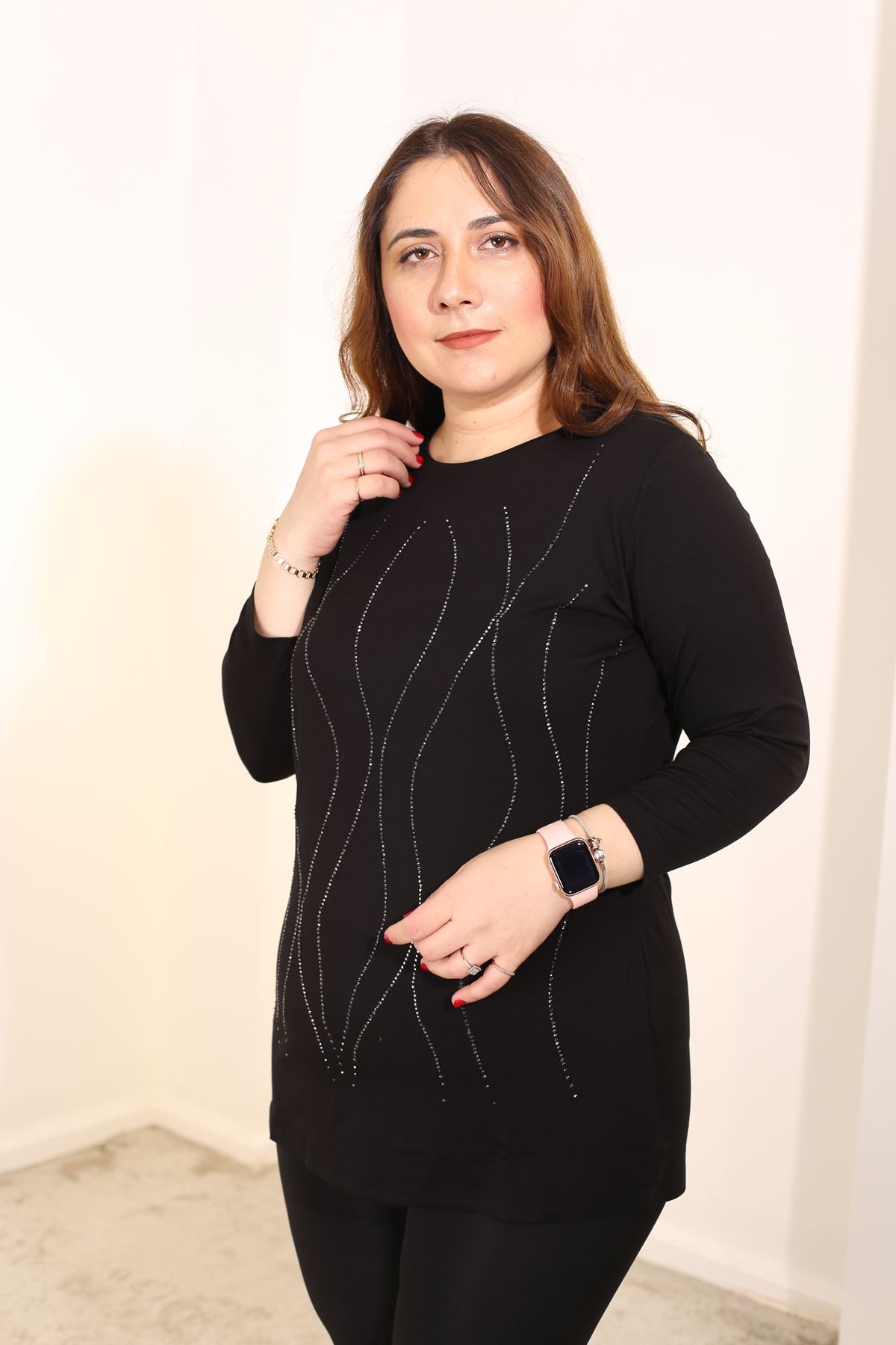 RENKTE BÜYÜK BEDEN TAŞLI SİYAH BLUZ