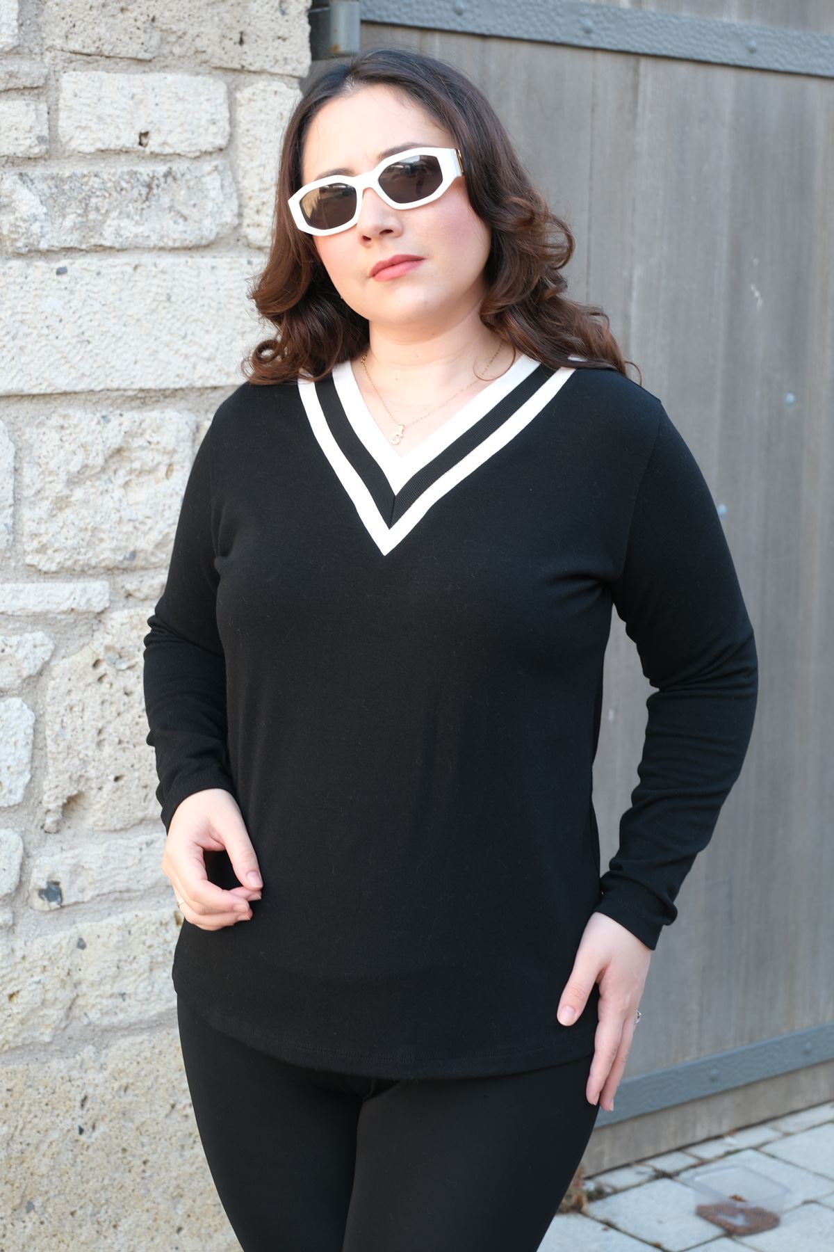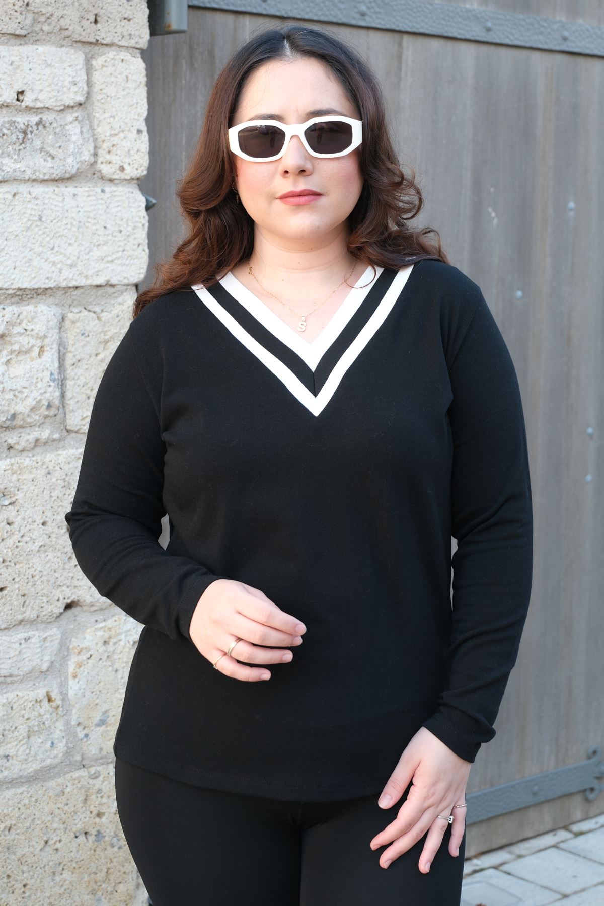RENKTE V YAKA SİYAH DESENLİ TASARIM BLUZ