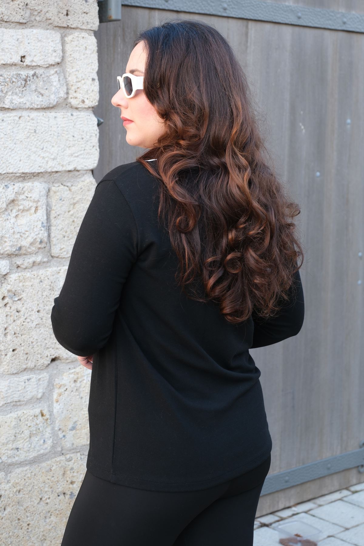 RENKTE ARKASI İNCİLİ TASARIM SİYAH BLUZ