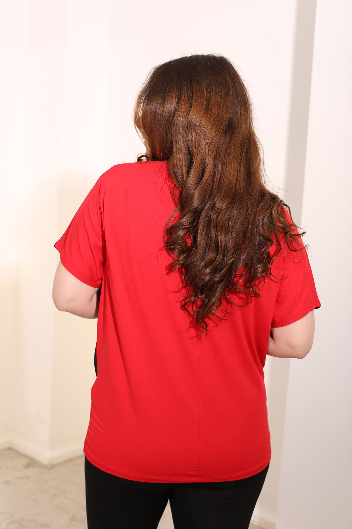 RENKTE BÜYÜK BEDEN ZİNCİRLİ TASARIM KIRMIZI BLUZ